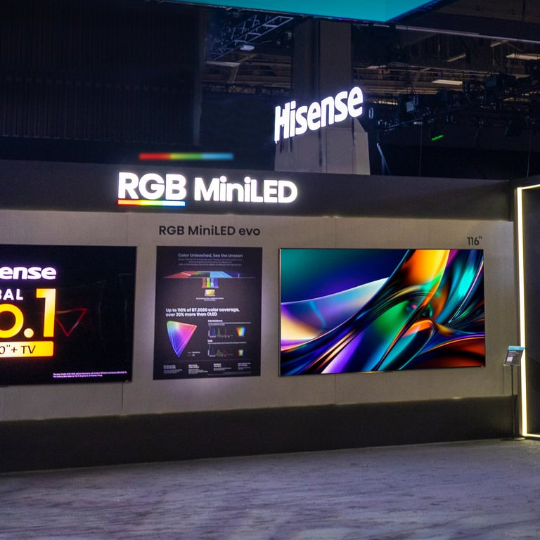 While the booth featured everything from laundry to robotics, Hisense remains a display powerhouse at its core. This year, the company debuted RGB MiniLED evo, a system-level evolution in large-screen technology.